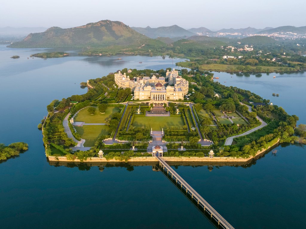 Raffles Udaipur is our recommendation for your stay, situated on its own private island within Udai Sagar Lake. The resort combines heritage design with modern luxury. Rooms are thoughtfully appointed with views over the water, and public areas include landscaped gardens and water features. Dining is led by Sawai Kitchen, which focuses on royal Rajasthani recipes and seasonal produce, while The Dining Room offers global fare in an elegant and bright environment.