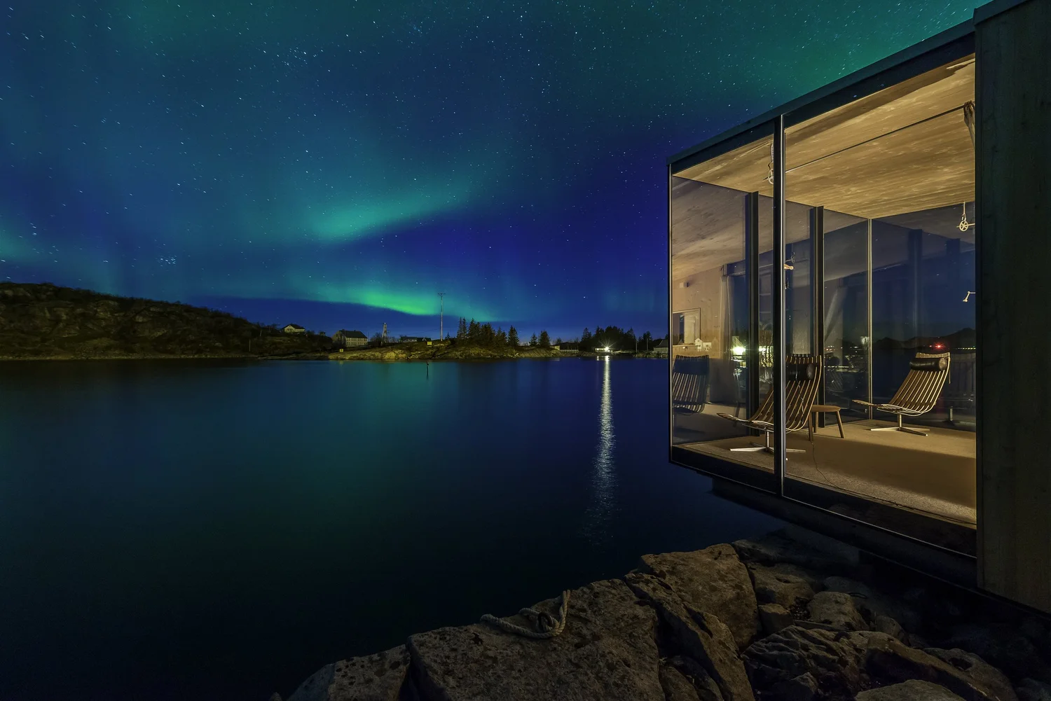 Manshausen Hotel is a remote, design-led retreat located on a private island in the Steigen archipelago, above the Arctic Circle. The property consists of a small collection of minimalist, glass-fronted cabins positioned along the shoreline, each offering uninterrupted views of the surrounding fjords, mountains, and open sea. Designed to blend into the natural environment, the cabins emphasize simplicity, comfort, and a strong connection to the landscape.